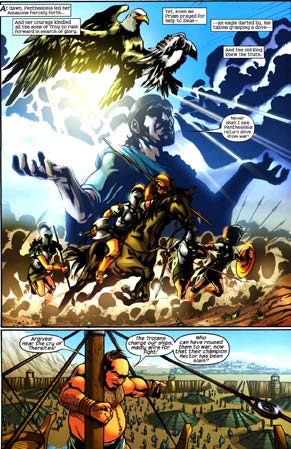 Pentesilea, regina delle Amazzoni, figlia di Ortrera e di Ares, sbarcò a Troia col suo esercito di donne guerriere in aiuto a Priamo. Il suo intervento provocò la morte di molti Greci, come Macaone. Secondo alcune versioni del ciclo, Pentesilea riuscì anche nell’impresa di uccidere Achille, ma poiché questi era un supereroe, fu resuscitato dalla madre Teti. Pentesilea si scontrò quindi (o di nuovo) con Achille, che nel frattempo si era innamorato di lei, ma la uccise comunque.
